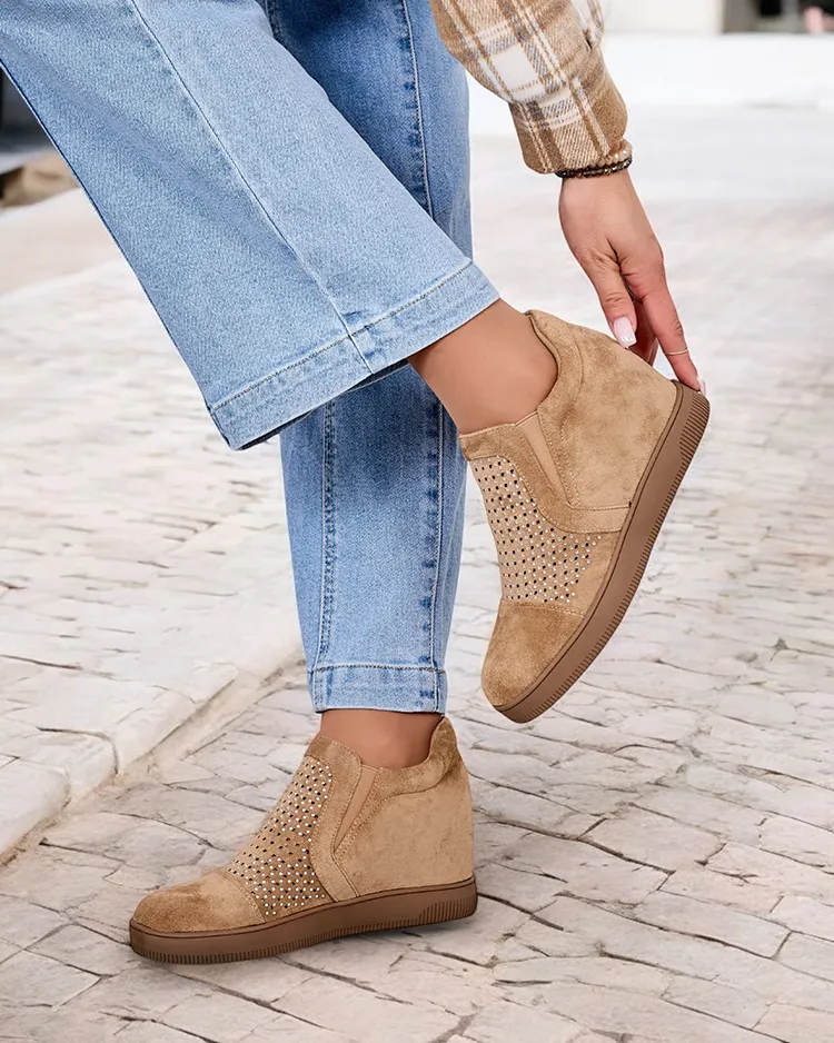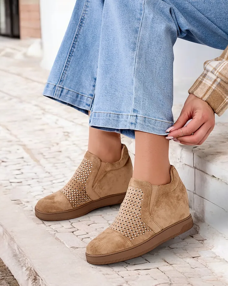 - Модные женские спортивные туфли на скрытом якоре, выполненные из эко-замши. Внутри мягкая стелька из эко-кожи. Туфли-слипы, украшенные цирконами. Станут отличным украшением для повседневного стиля.