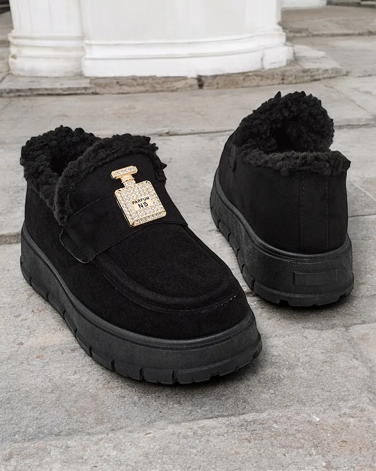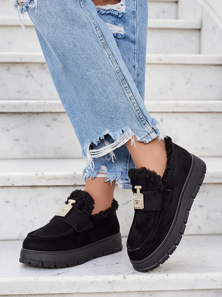 - Утепленные женские мокасины на платформе. Классическая модель из замшевой экологической кожи и наполнения a' la овчина. Подошва в форме платформы. На голенище несъемное украшение с цирконами.