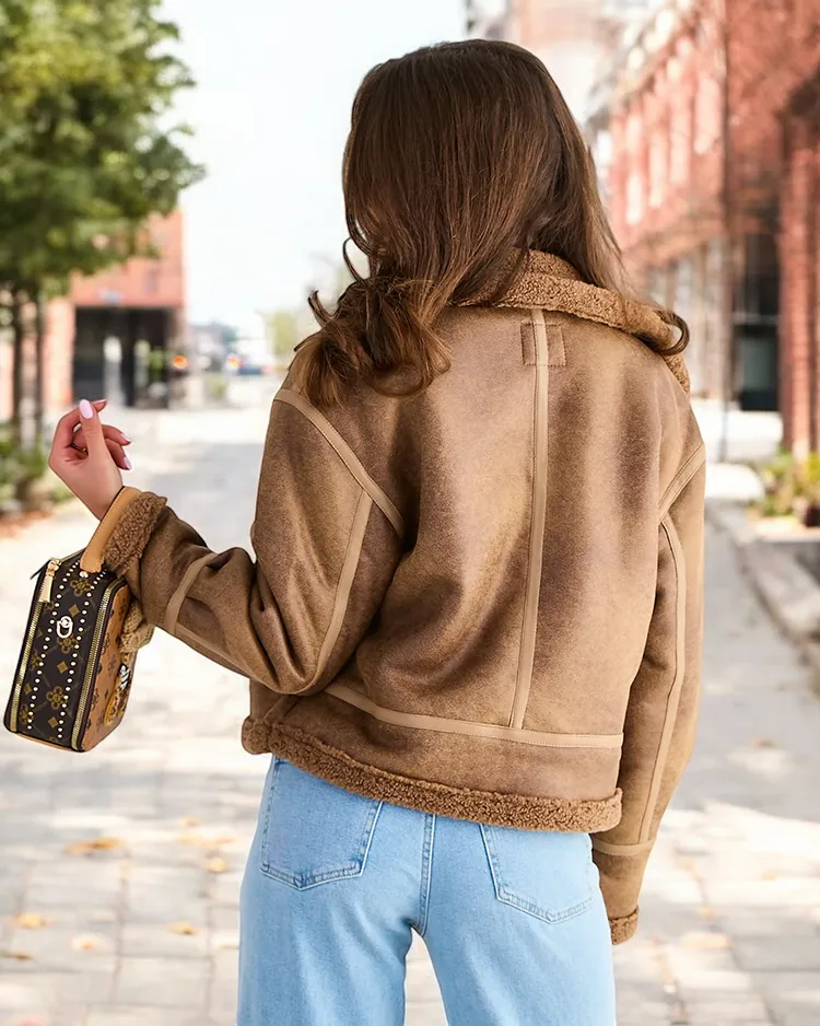 • Двухслойная женская байкерская куртка из искусственной кожи и меха. Модель имеет 2 кармана, широкий воротник, застежку-молнию и кнопки-застежки.