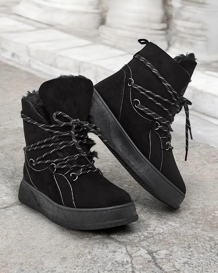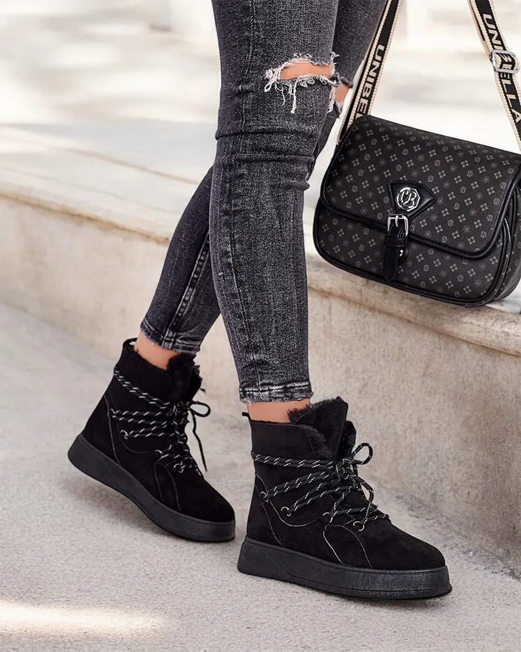 • Женские зимние ботинки с верхом из замши и экокожи. Внутри приятный мех, ботинки можно надеть на ногу и закрепить на шнуровке. Идеально подходят для зимы!