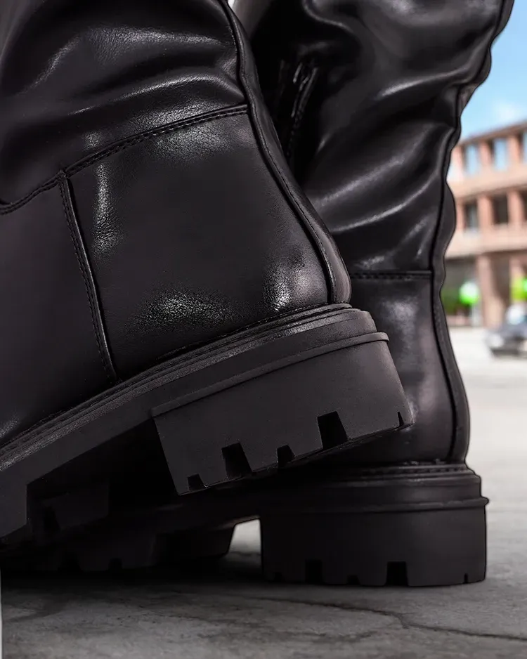 • Стильные женские ботинки до середины икры на плоском каблуке. Верх выполнен из экокожи, с нежным мехом внутри. Модель застегивается на молнию. Идеально подходит для повседневных осенних нарядов!