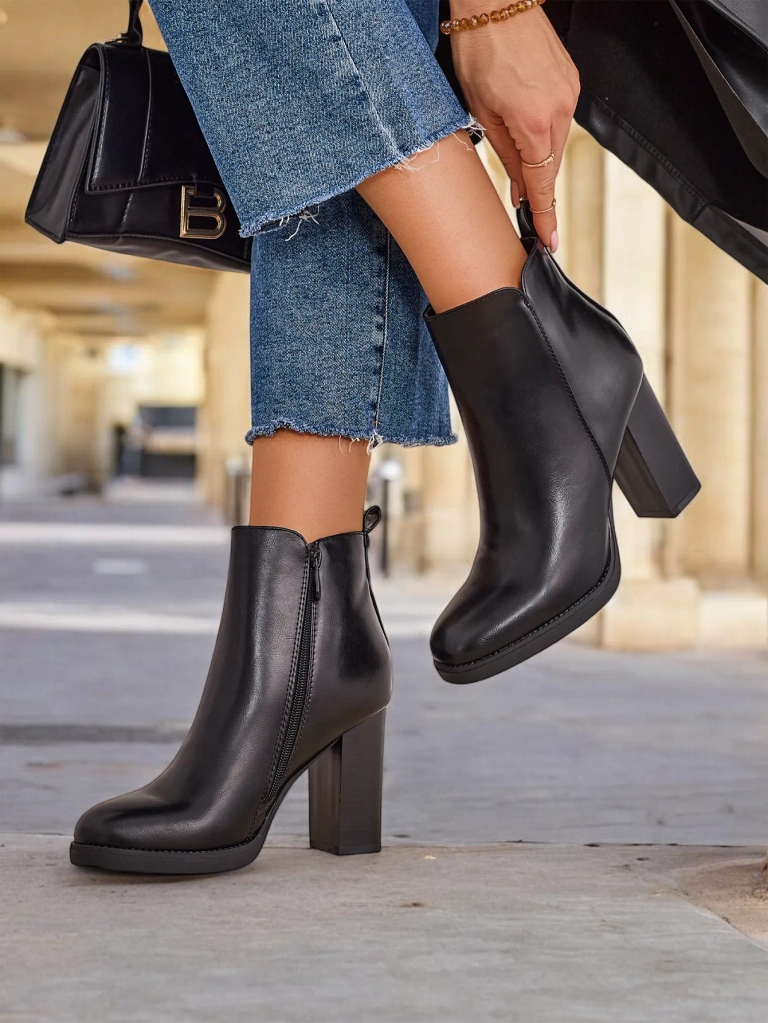 - Стильные женские ботильоны на высоком каблуке. Верх из синтетической кожи. Внутри наполнены нежным мехом. Модель с молнией, острым носком. Отличный выбор для осени!