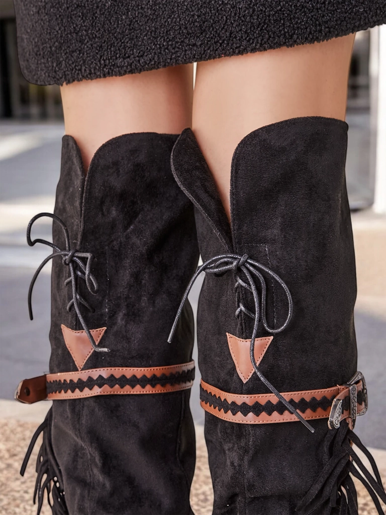 - Стильные ботфорты до колена для женщин с скрытой клиновидной пяткой. Верх выполнен из эко-замши. Подкладка из ткани. Модель без застёжек, украшенная бахромой и тиснеными ремешками.