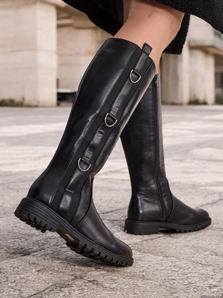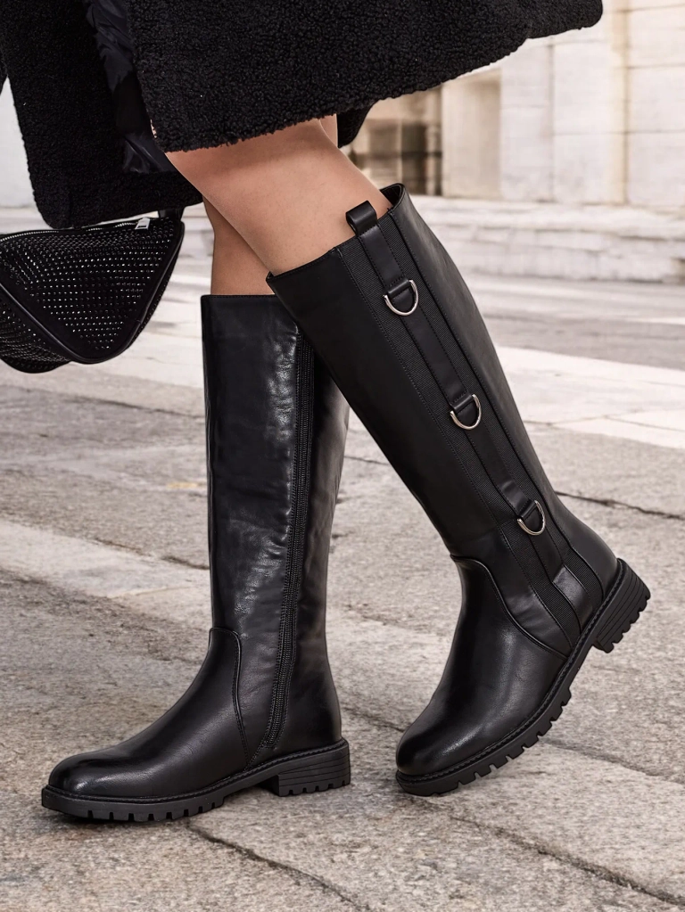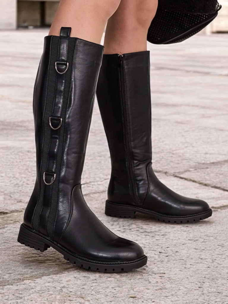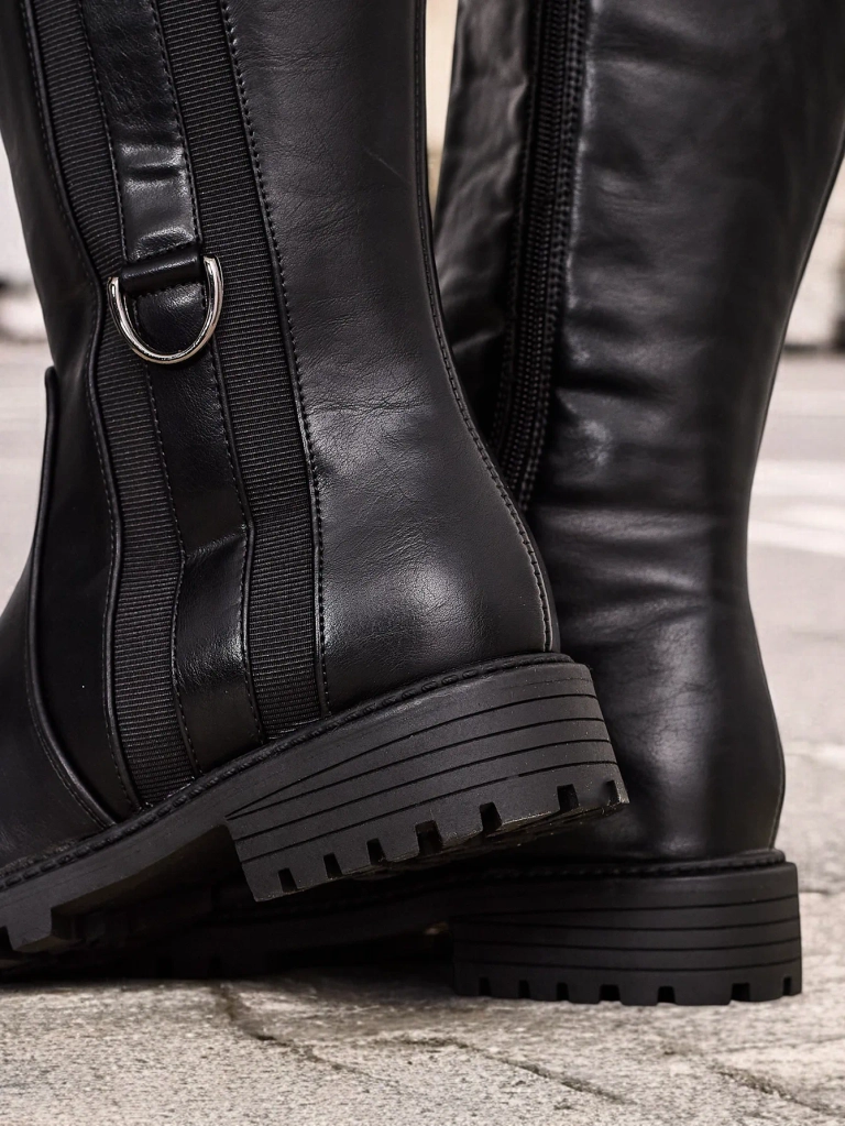 • Женские сапоги до колена, изготовленные из экокожи. Модель на плоском каблуке. Обувь застегивается на молнию. Тканевая стелька. У них есть эластичная вставка сбоку.