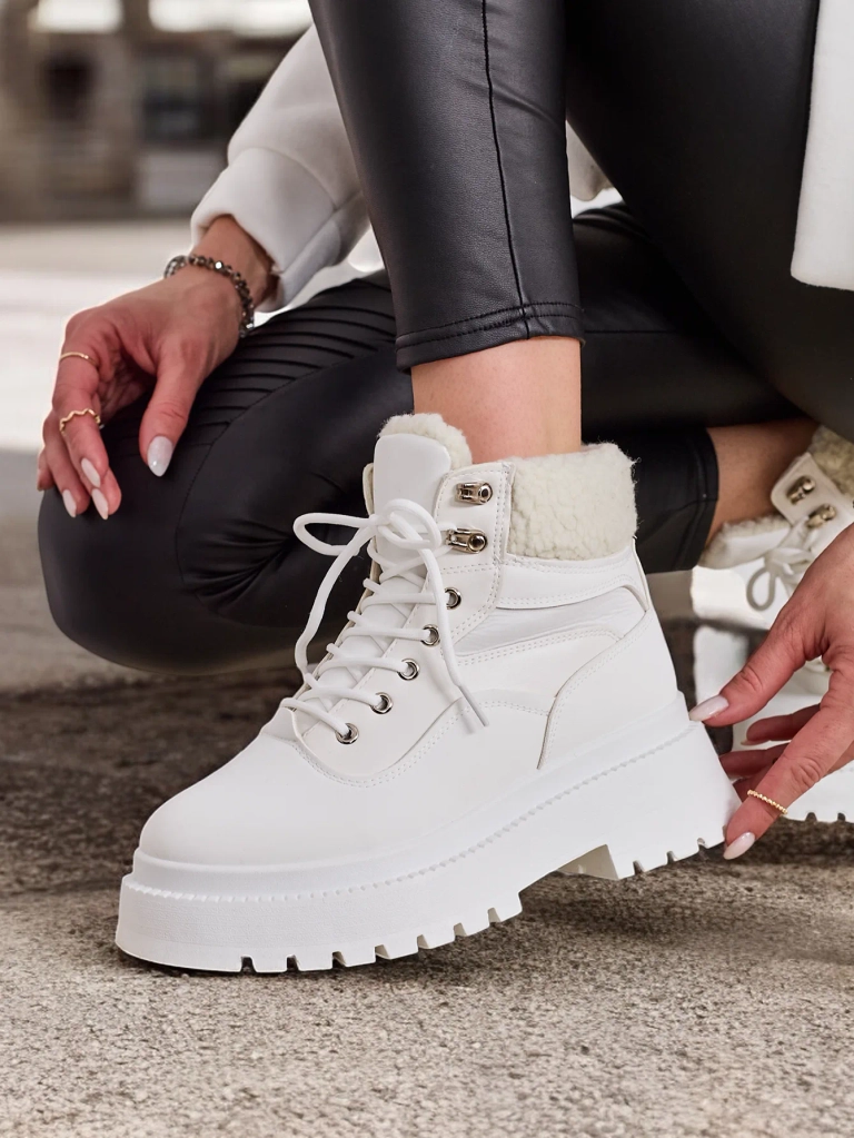 - Временные женские снежные ботинки на толстой подошве. Верх изготовлен из экокожи. Внутри есть подкладка в виде меха, ботинки завязываются. Идеальны для прохладных сезонов!