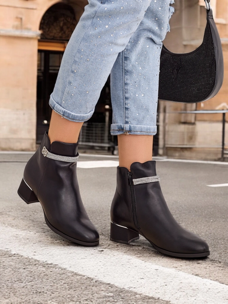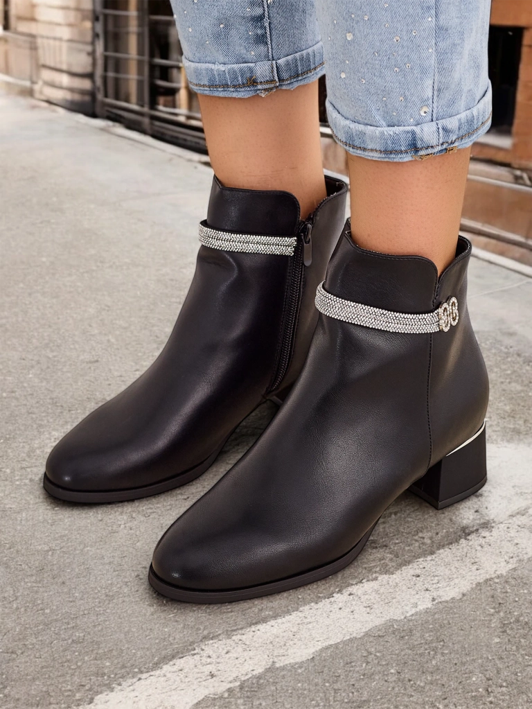• Выдающиеся женские ботинки на низком каблуке, изготовленные из патентованной экокожи. Внутренняя сторона обита нежным мехом. Модель застегивается на молнию. Они украшены цирконами. Идеальны для осенних нарядов!
