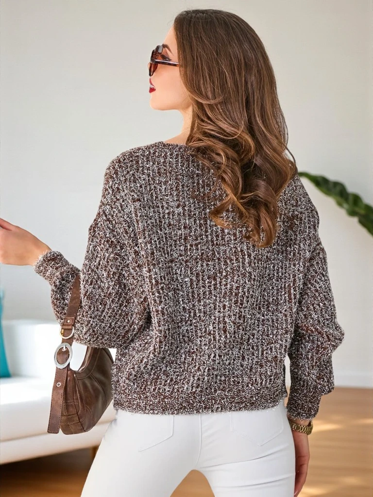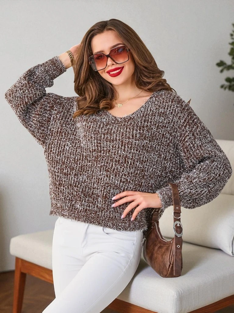- Этот стильный свитер воплощает комфорт и обаяние. Изготовлен из мягкого материала, свитер имеет V-образный вырез и длинные рукава. Свободный покрой и блестящая нить придают ему уникальное очарование!