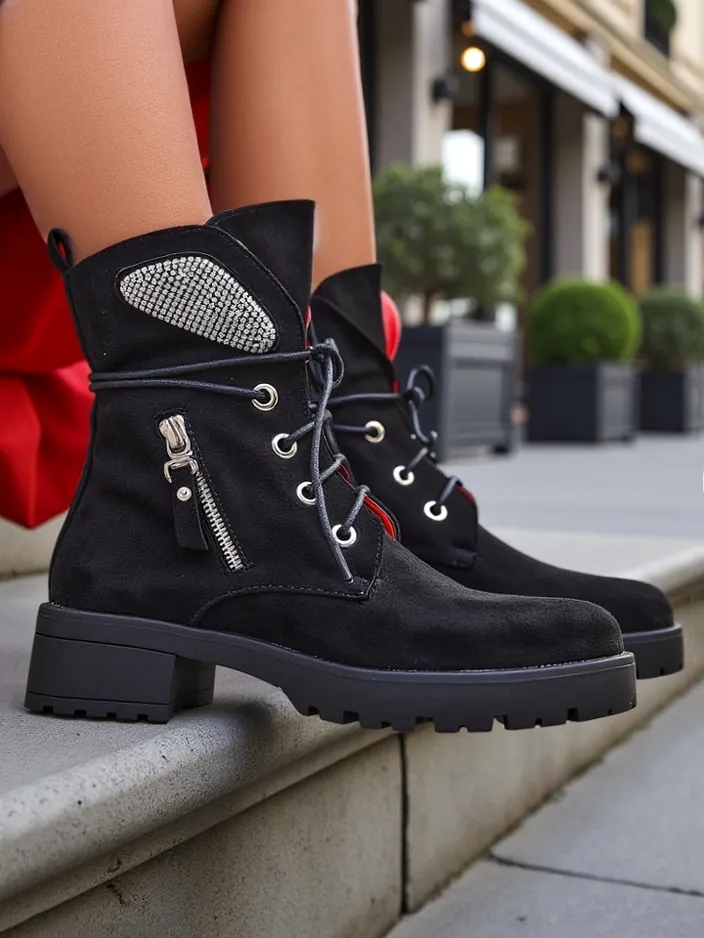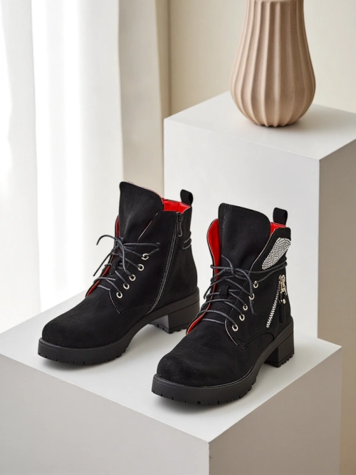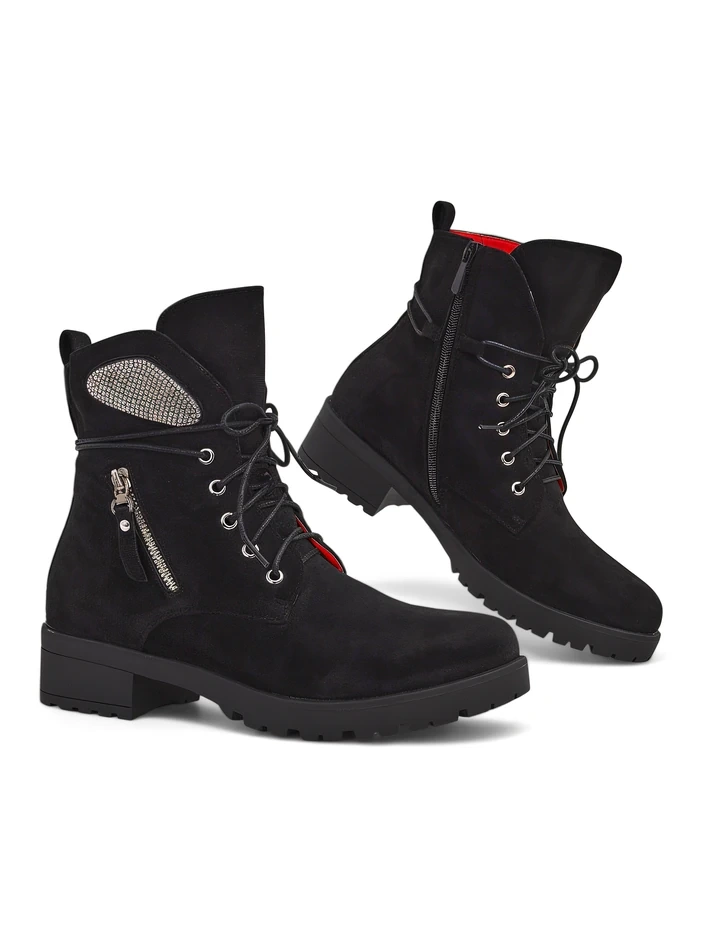 • Женские рабочие ботинки – это исключительная обувь, которая сочетает в себе стиль и комфорт. Изготовлены из эко-дружелюбной замши и утеплены мягким мехом. Модель шнуровка и имеет молнию. Обувь украшена тонкими декорациями.