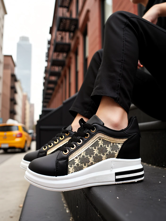 - Удобные женские спортивные туфли с скрытой платформой, изготовленные из эко-кожи и принтованной ткани. Модель на шнуровке, текстильная стелька. Эластичный верх аккуратно адаптируется к стопе. Супер стильное дополнение!
