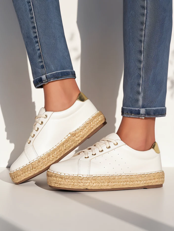Aurelia Denim Espadrillos to wyjątkowe damskie trampki łączące w sobie styl casualowy, modny denim oraz elementy inspirowane klasycznymi espadrylami. Wierzch buta został wykonany z wysokogatunkowej tkaniny w kolorze złotym z niebieskim odcieniem, która nie tylko prezentuje się stylowo, ale również zapewnia przewiewność i komfort noszenia. Wnętrze buta wyłożone jest miękką wkładką ze skóry ekologicznej, co gwarantuje wygodę nawet podczas wielogodzinnego użytkowania.Podeszwa o wysokości 3,5 cm została opleciona naturalnym, jutowym sznurkiem, który nadaje obuwiu lekkości oraz inspirowany jest śródziemnomorskim stylem. Proces produkcyjny opiera się na precyzyjnym zszywaniu wierzchu z podeszwą, co zwiększa trwałość produktu i eliminuje ryzyko rozklejania. Całość powstaje w zgodzie z zasadami produkcji zrównoważonej, bez wykorzystania materiałów pochodzenia zwierzęcego.Główne zalety Aurelia Denim Espadrillos to lekkość, wygoda oraz ponadczasowy design, który świetnie uzupełnia codzienne stylizacje. Tkanina gwarantuje dobrą oddychalność stóp, a płaski obcas zapewnia stabilność i odpowiednią amortyzację.:- Do miejskiego looku: zestaw z białymi jeansami, basicowym T-shirtem oraz torebką typu crossbody.- Na randkę lub wyjście do kawiarni: łącz z sukienką w stylu boho lub romantyczną spódnicą midi.- Na wyjazd za miasto: doskonałe w połączeniu z szortami z wysokim stanem, lnianą koszulą i słomkowym kapeluszem.:- Buty czyść delikatnie wilgotną ściereczką, unikając silnych detergentów.- Pozostaw do wyschnięcia w przewiewnym miejscu, z dala od promieni słonecznych.- Regularnie odkurzaj podeszwę jutową za pomocą miękkiej szczotki.- Przechowuj w oryginalnym pudełku lub woreczku bawełnianym, aby zachować kształt.:Sneakersy ze stylizowanymi elementami espadryli są jednym z topowych wyborów ostatnich sezonów – denim i naturalne materiały to klucz do modnych, ekologicznych stylizacji. Model Aurelia Denim pozwala na swobodną zabawę modą i spełnia najnowsze wytyczne stylu eko, casual chic i urban boho.Wybierz Aurelia Denim Espadrillos, aby dodać swojej szafie obuwie, które harmonijnie połączy komfort z oryginalnym wyglądem – to obowiązkowa pozycja dla każdej miłośniczki mody!
