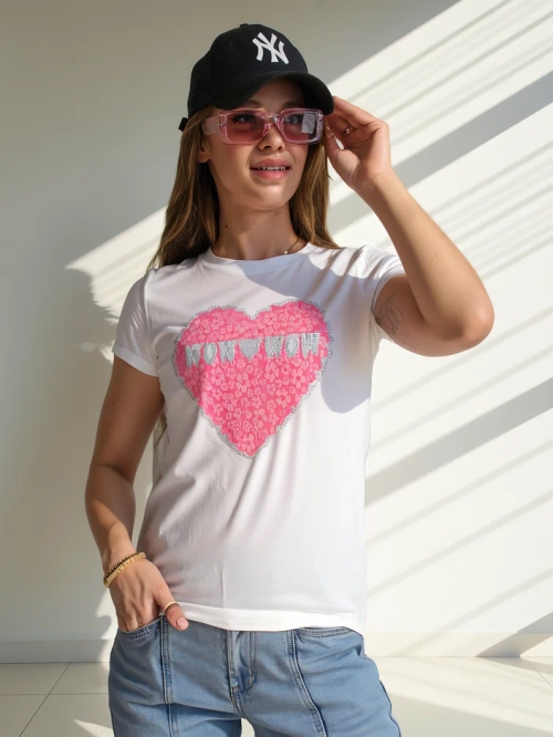 - Оригинальная женская блузка с круглым вырезом, изготовленная из мягкой и приятной на ощупь ткани. Вся модель украшена яркими пайетками, а короткий рукав придает легкость. Идеальный выбор для создания модных и стильных нарядов!