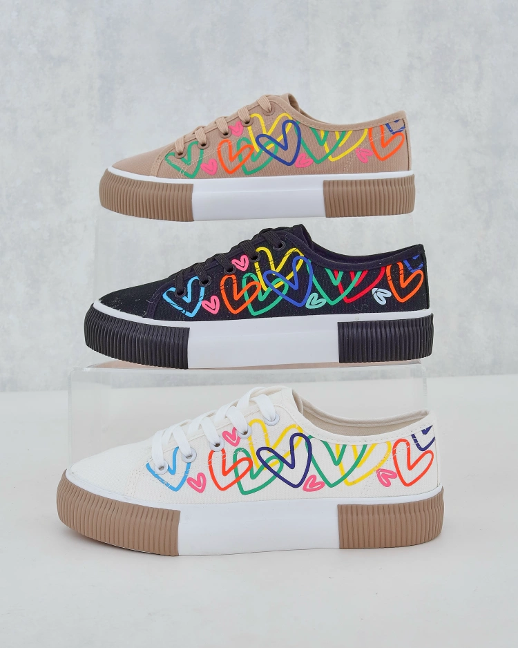 - Кроссовки для женщин из текстильного материала. Шнуровка с отделкой в виде сердечного принта. Классическая резиновая подошва. Эта обувь отлично подойдет для повседневной носки!