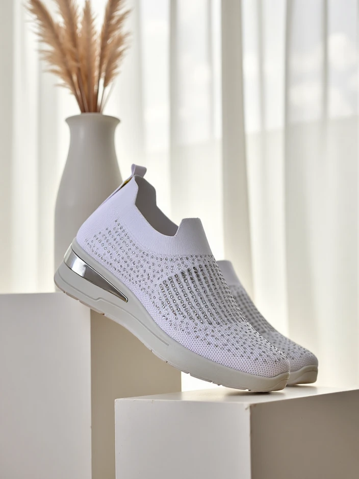 - Модные женские кроссовки на танкетке из ткани, украшенные стразами. С мягкой текстильной стелькой. Обувь без застежки. Они станут отличным украшением для повседневных образов.