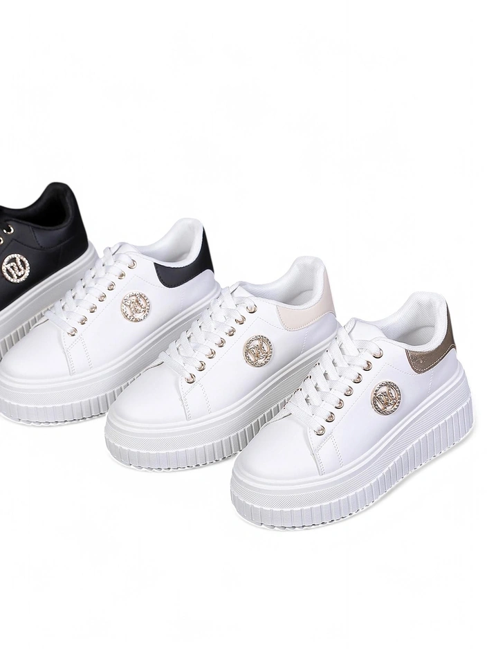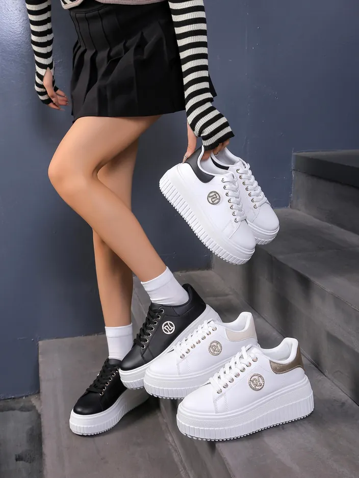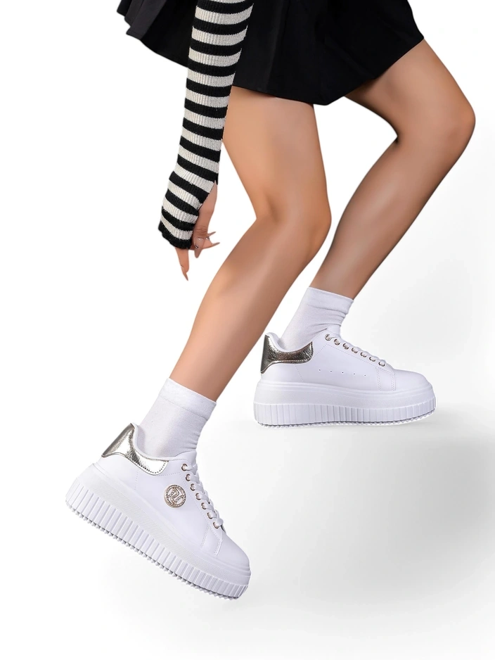 Эти современные кроссовки изготовлены из высококачественных синтетических материалов, которые обеспечивают долговечность и комфорт. Благодаря дышащей технологии ваши ноги остаются сухими и удобными в течение всего дня. Платформа добавляет не только стиль, но и защиту от ударов, что делает их идеальным выбором для длительных прогулок. Золотые детали придают обуви элегантность, а тонкие линии делают их подходящими для любого наряда. При надлежащем уходе эти кроссовки прослужат вам долго.