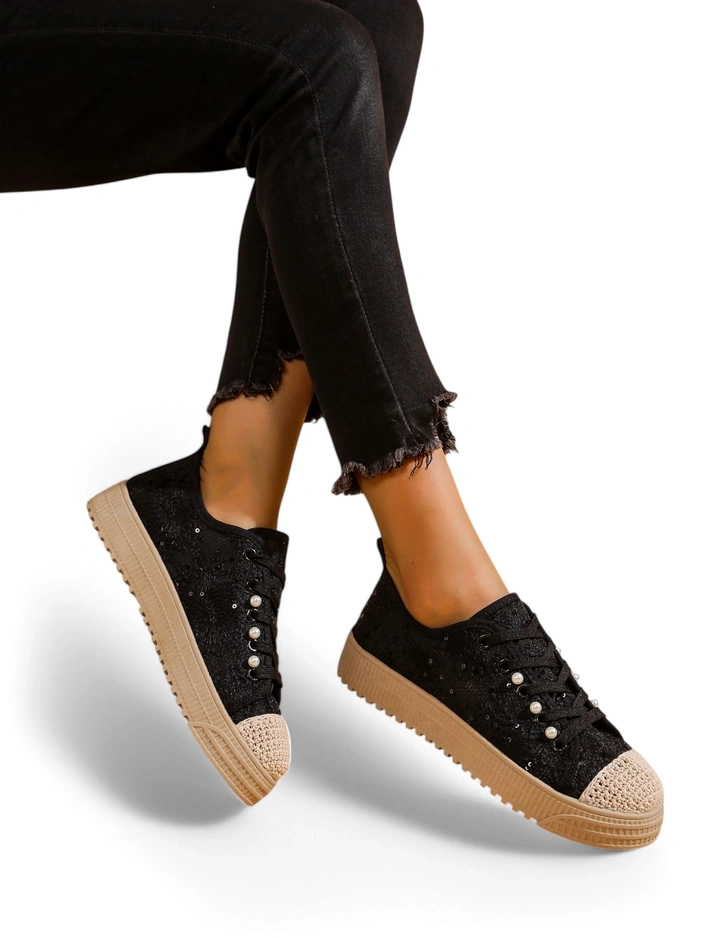 • Женская обувь на плоской подошве. Эта пара в повседневном стиле сделана из текстильного материала с кружевной отделкой и текстильной стелькой. Модель украшена декоративными пайетками. Идеально подходит для тех, кто ценит комфорт!