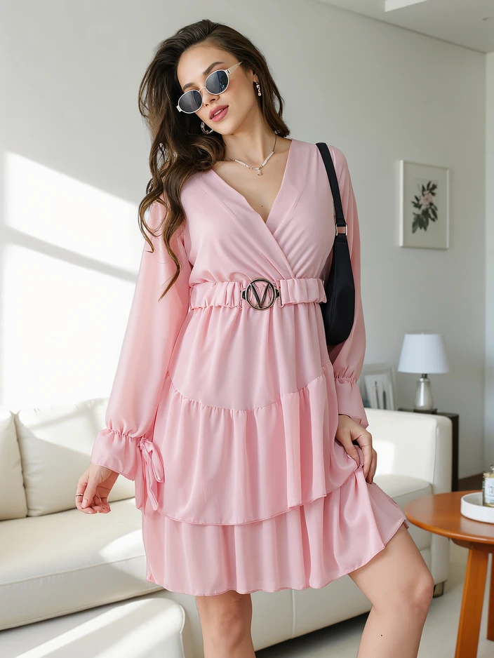 - Мини-туника с рюшами. Модель с длинными рукавами, обернутым вырезом и резинкой на талии. Обязательный элемент вашего гардероба!