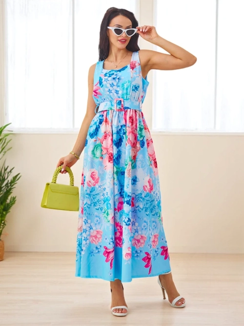 Женское миди платье из вискозы Royalfashion на бретелях, с поясом в различных цветочных узорах