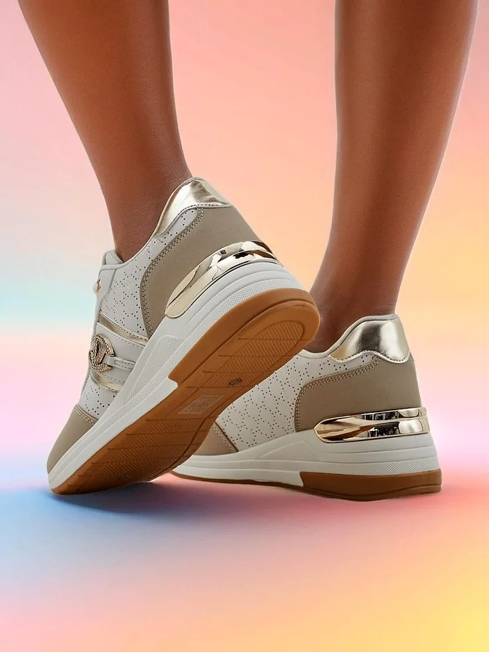 Koturn o wysokości 6 cm subtelnie wysmukla sylwetkę oraz dodaje pewności kroku, nie obciążając przy tym stopy. Materiały użyte do produkcji posiadają atesty potwierdzające ich przyjazność dla skóry i środowiska. Nowoczesne wykończenie oraz kontrastujące detale, takie jak srebrne akcenty oraz ozdobna aplikacja boczna, wpisują się w aktualne trendy inspirowane stylem athleisure oraz wygodą miejskiego życia.