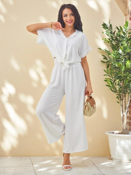 • Женский повседневный комплект из приятной ткани. Рубашка на пуговицах с завязкой внизу и короткими рукавами. Широкие брюки с резинкой на талии. Весь комплект украшен стразами!
