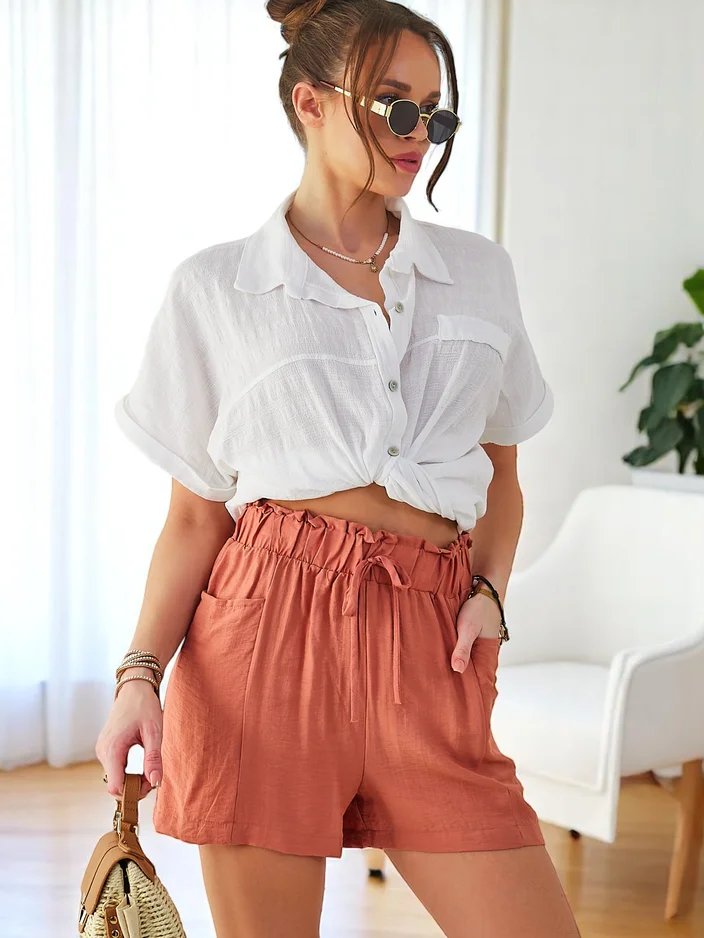 - Легкие тканевые шорты для женщин. Модель с высокой талией, двумя карманами и эластичным поясом. Идеальный выбор на лето! ЗАМЕТКА: Точность измерений (+/-) 1 см.