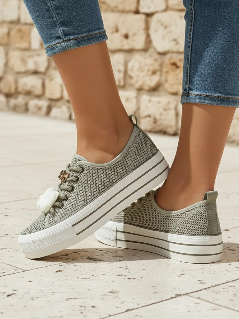 - Перфорированные кроссовки из ткани, внутренняя часть также обшита материалом. Очень удобные благодаря резиновой подошве. Обувь подходит к многим повседневным нарядам!