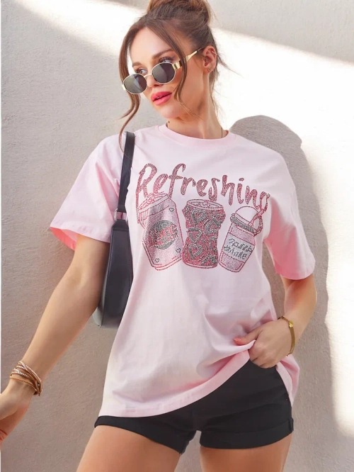 - Женская футболка из хлопка с принтом, украшенная стразами, совмещающая комфорт с тонким блеском. Идеально подходит для повседневных стилей, добавляет уникальное очарование к любому образу.