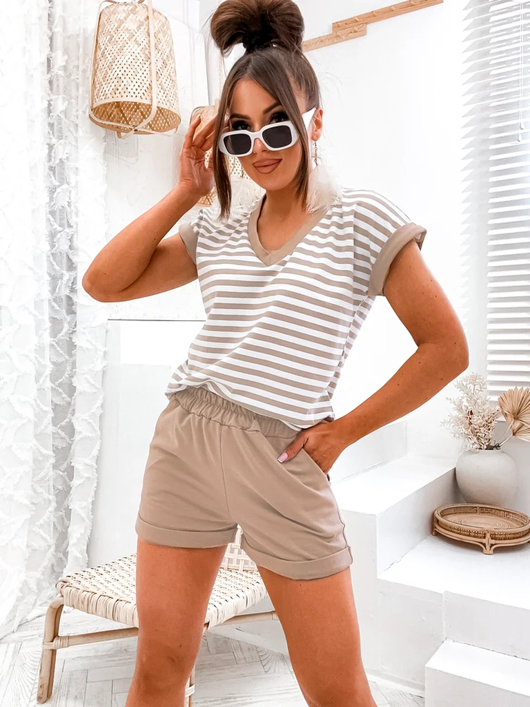 - Весенний хлопковый женский комплект с шортами и футболкой. Шорты имеют 2 кармана и эластичный пояс. Футболка с короткими рукавами украшена полосатым узором. Отличный комплект для теплых дней! Примечание: точность измерений (+/-) 1 см.