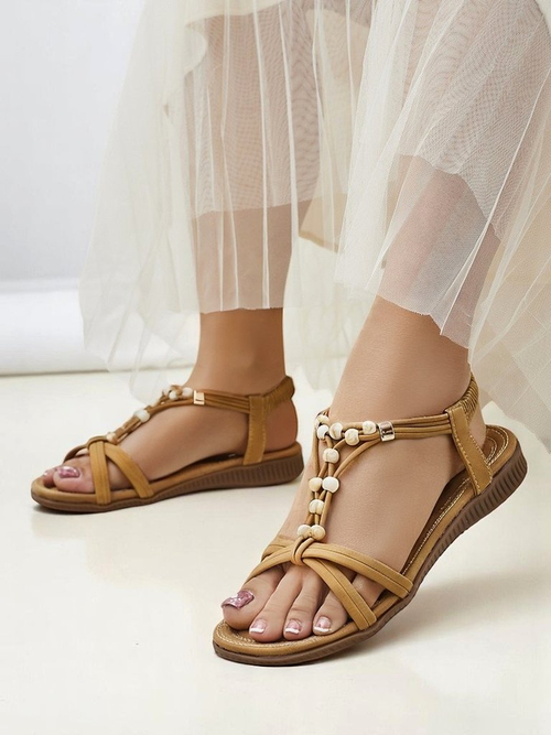 • Женские сандалии на плоской подошве – идеальное решение для жарких летних дней. Ремешки выполнены из приятной экологичной кожи. Передняя часть украшена элегантными плетеными ремешками и бусинами. Обувь без застежек.