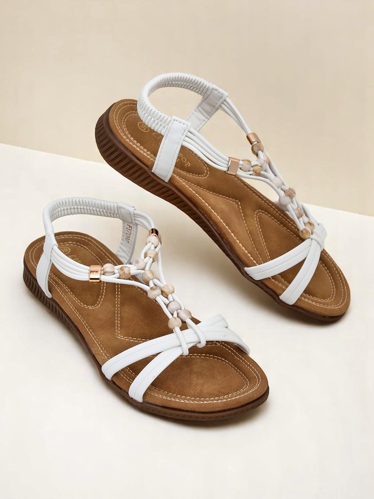 • Женские сандалии на плоской подошве – идеальное решение для жарких летних дней. Ремешки выполнены из приятной экологичной кожи. Передняя часть украшена элегантными плетеными ремешками и бусинами. Обувь без застежек.