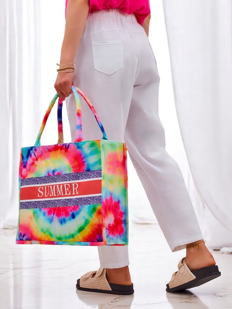- Большая женская сумка из ткани с ярким рисунком и надписью "SUMMER". Одно отделение, легкая и вместительная — идеально подходит для пляжа, отдыха и летних образов!