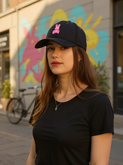 - Очаровательная кепка для нее, украшенная стильной нашивкой с зайчиком. Регулируемая застежка обеспечивает комфорт, а женственный дизайн придает образу характер.