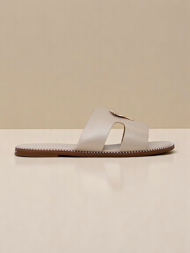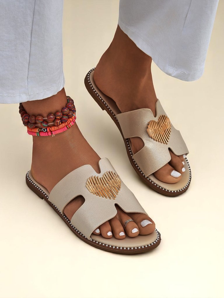 - Шлепанцы из экокожи на плоской подошве с золотым украшением в форме сердца. Стиль и комфорт в одном — идеально подходят для лета, прогулок по городу и легких, женственных образов.