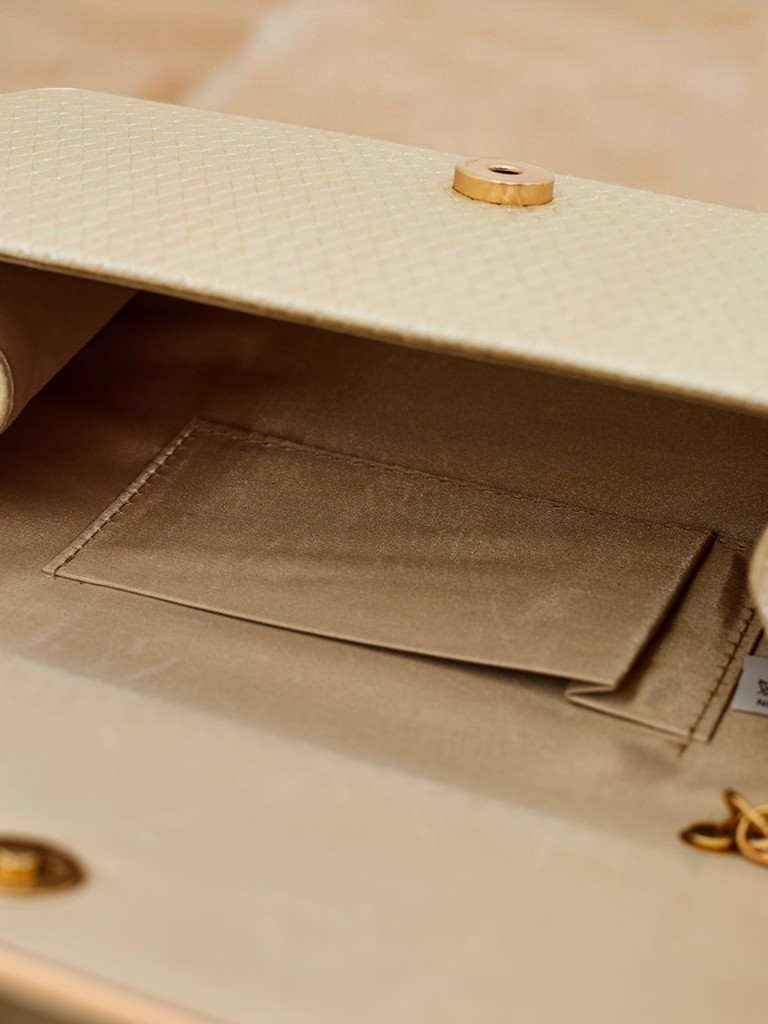 - Конверт-клатч из экокожи, покрытый тканью с мерцающей нитью и деликатным тиснением. Застегивается на магнит, с отстегивающимся ремешком – идеально подходит для вечерних выходов.