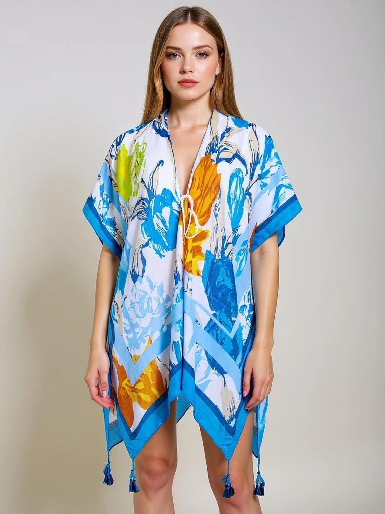 - Летняя пляжная туника-парео с V-образным вырезом и асимметричным низом – стильный must-have для отпуска. Легкая, воздушная ткань и эффектный узор подчеркивают женственность, а свободный крой обеспечивает комфорт в жаркие дни. Идеально подходит для пляжа и