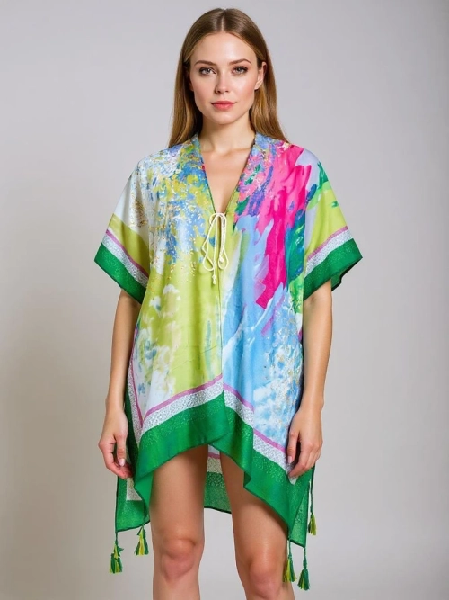 - Летняя пляжная туника-парео с V-образным вырезом и асимметричным низом – стильный must-have для отпуска. Легкая, воздушная ткань и эффектный узор подчеркивают женственность, а свободный крой обеспечивает комфорт в жаркие дни. Идеально подходит для пляжа и