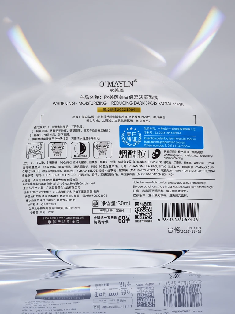 • Осветляющая и увлажняющая тканевая маска интенсивно увлажняет кожу, выравнивает тон и придает сияние. Идеально подходит для уставшей, тусклой кожи — всего после одного применения кожа становится свежей, гладкой и сияющей.
