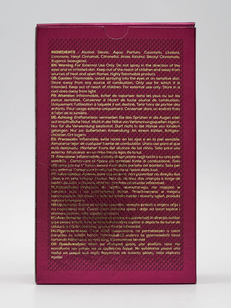• Отличительный и чувственный парфюм, который раскрывается нотами горького миндаля, ликёра и сочной вишни. В сердце композиции — аккорды сливы, розы и жасмина, переходящие в глубокую, пряную базу с ванилью, бобами тонка, древесными нотами и специями.