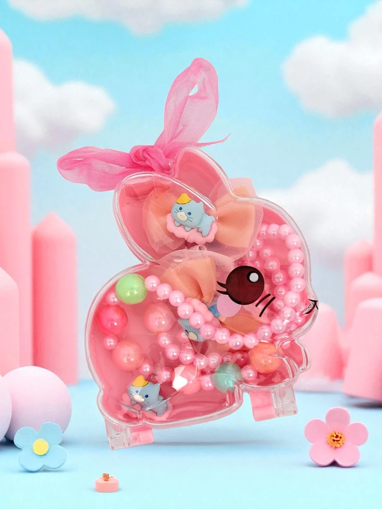- Яркий детский комплект украшений Bambina Allegra – ожерелье, браслет и заколки для волос в очаровательном футляре в виде зайчика.