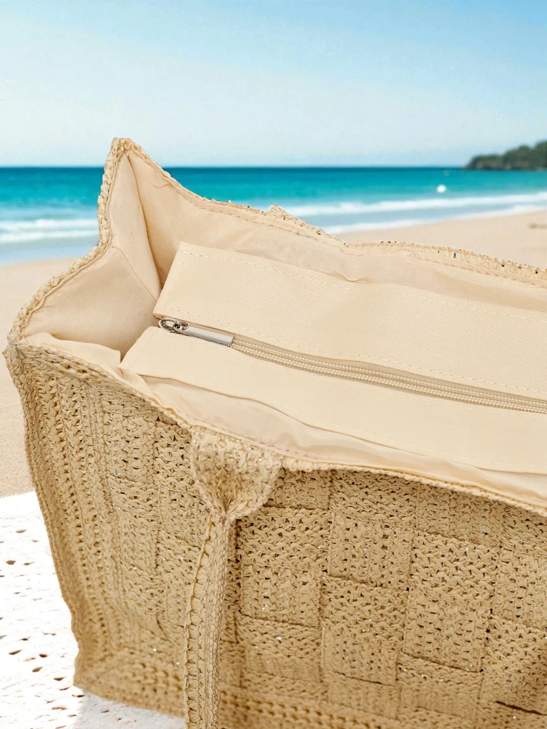 • Стильная соломенная сумка с одним отделением и карманом на молнии. Легкая и вместительная, идеально подходит для летних дней. Отлично сочетается с повседневными образами, обеспечивая комфорт и порядок, сохраняя при этом модный, праздничный вид.