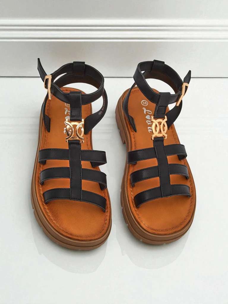 - Женские сандалии-гладиаторы из искусственной кожи, застегивающиеся на пряжку, украшенные золотистым акцентом. Стильные и удобные – идеально подходят для летних, женственных образов с ноткой классики.