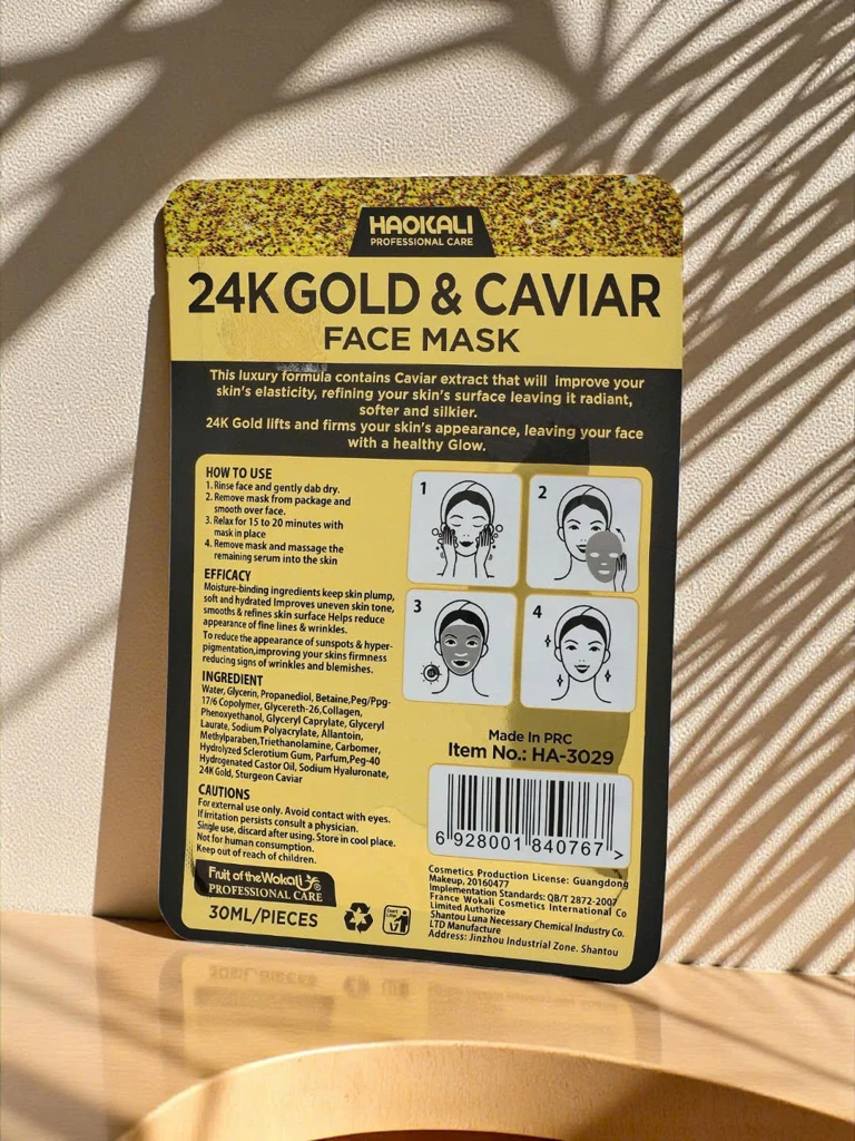 - Маска для лица в виде салфетки с 24-каратным золотом и икрой – интенсивное питание, укрепление и осветление кожи. Разглаживает, увлажняет, повышает эластичность и регенерирует. Защищает от старения и успокаивает раздражения. Идеально подходит для ухода за