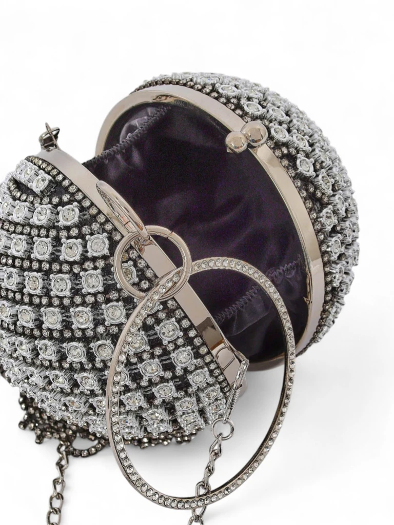 - Круглая сумочка-клатч с блестящими цирконами и элегантной цепочкой на плечо. Идеально подходит для вечерних выходов — привлекает взгляды и дополняет любой образ.