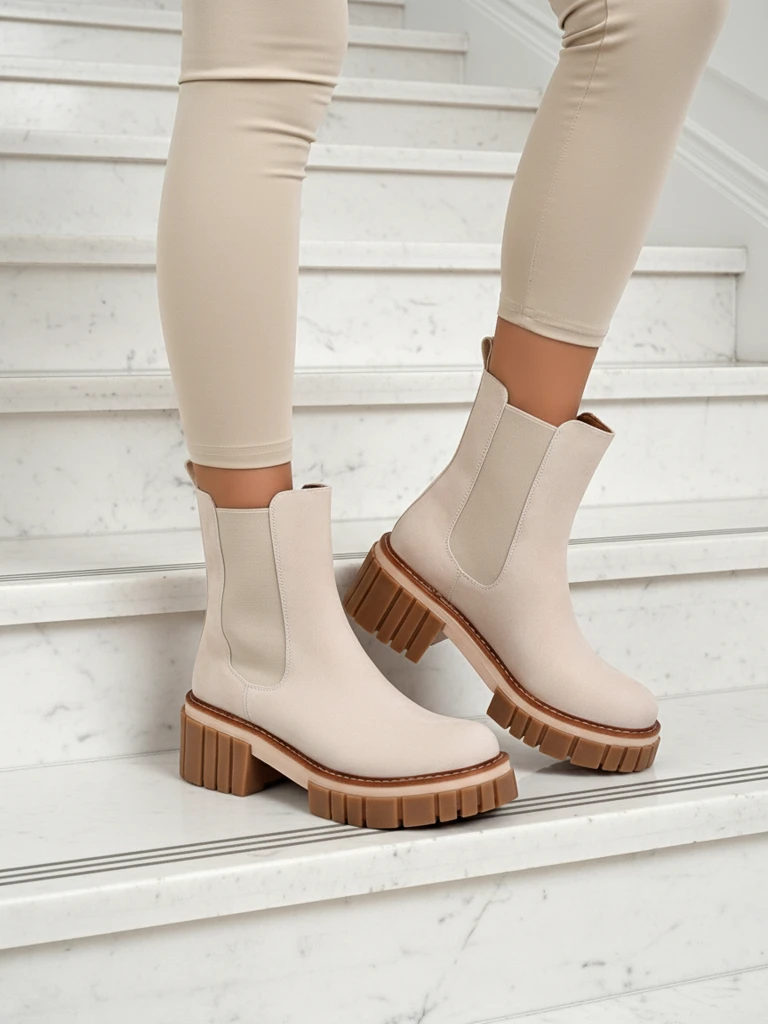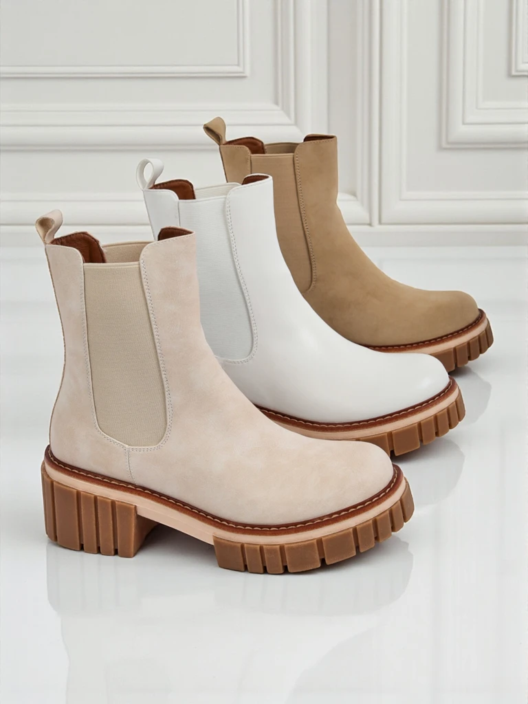 Бежевые ботильоны Callista – это уникальное сочетание классики и современности в женственном исполнении. Изготовленные из высококачественной экологической замшевой кожи, они отличаются прочностью и приятным на ощупь материалом, который отлично имитирует натуральную замшу, но при этом прост в уходе и экологичен. Процесс производства этой кожи заключается в тщательной обработке микроволокон, что дает эффект глубокой матовой отделки и обеспечивает прочность даже при ежедневном использовании. Более того, материал имеет сертификат качества OEKO-TEX, подтверждающий отсутствие вредных веществ.Ботильоны Callista выполнены в модном, светлом бежевом оттенке. Каблук придает им современный характер, одновременно гарантируя устойчивость и комфорт при ходьбе, а круглый носок обеспечивает удобство даже в течение всего дня. Мягкая подкладка и эластичные боковые вставки облегчают надевание обуви и идеально адаптируются к форме стопы.Основные преимущества:- Исключительный комфорт благодаря устойчивому каблуку,- Универсальный дизайн – подходит как для повседневных, так и для более элегантных стилизаций,- Устойчивость к загрязнениям и легкость очистки (достаточно мягкой щетки или влажной ткани),- Экологичный материал, защищающий окружающую среду.Идеи для стилизации:1. Для повседневного городского образа носите их с облегающими джинсами, белой рубашкой и свободным пальто,2. На свидание или вечерний выход сочетайте ботильоны с расклешенным платьем миди и длинным кардиганом,3. Откройте для себя элегантность, сочетая их с костюмом в нейтральных цветах – это современный твист для офисных нарядов!Уход и хранение:Ботильоны чистим деликатной щеткой, предназначенной для замши, или влажной тканью без детергентов. Защищать от влаги и интенсивного солнечного света – лучше всего хранить их в проветриваемом месте на оригинальных стельках или в коробке.В настоящее время массивные подошвы и выразительные каблуки – один из важнейших осенних трендов, а классический бежевый цвет делает эти ботильоны универсальным предложением для каждой женщины, ценящей удобство, стиль и актуальные модные тенденции.