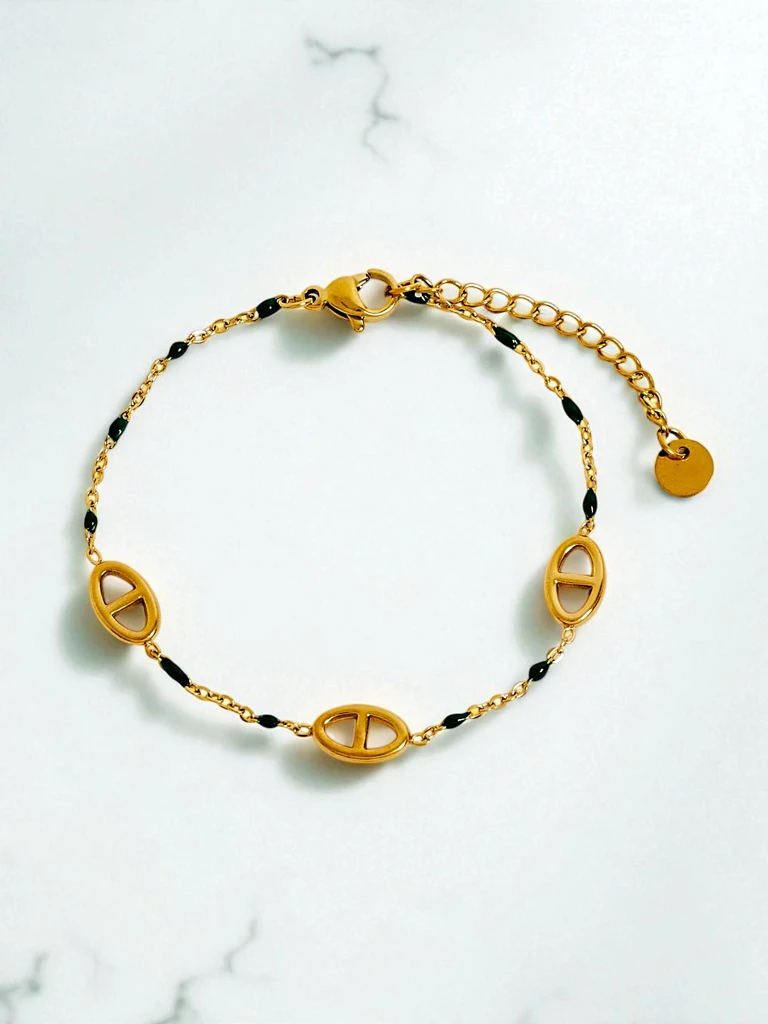 Браслет Delia Aurea – это изысканный аксессуар, созданный из высококачественной нержавеющей стали, покрытой слоем золота методом PVD, что обеспечивает прочность и исключительную устойчивость к истиранию и потускнению. Декоративные элементы вдохновлены классическими греческими мотивами, придающими браслету неповторимый античный характер. Черная эмаль, вплетенная в золотую цепочку, тонко подчеркивает эксклюзивный дизайн и внимание к каждой детали. Изделие не содержит никеля, что делает его подходящим даже для людей с чувствительной кожей. Delia Aurea – это предложение для тех, кто ценит вневременной стиль с ноткой элегантности. Он прекрасно подойдет в качестве деликатного акцента как для повседневных образов, так и для вечерних нарядов. Браслет очень легкий и удобный в ношении, а регулируемая застежка позволяет идеально подогнать его под любое запястье. 1. Носите браслет с белой рубашкой, темными джинсами и золотыми серьгами – элегантный, но непринужденный образ для встречи с друзьями или на работу. 2. Сочетайте Delia Aurea с маленьким черным платьем и изящным клатчем – он подчеркнет шик и добавит блеска во время важных торжеств. 3. Комбинируйте его с воздушным, светлым платьем макси и аксессуарами в оттенках бежевого и коричневого – идеальное решение для летних прогулок или фестивалей. Браслет следует хранить в сухом месте, вдали от прямых солнечных лучей и влаги. Чистите мягкой ювелирной тканью, избегая сильных моющих средств. Избегайте контакта с водой, духами и косметикой, чтобы сохранить блеск и долговечность позолоты. Позолоченные украшения с элементами винтажного стиля и античными мотивами – абсолютный хит последних сезонов. Сочетание золота с черным создает невероятно стильный, универсальный образ, который доминирует как на подиумах, так и в повседневных образах модниц по всему миру.