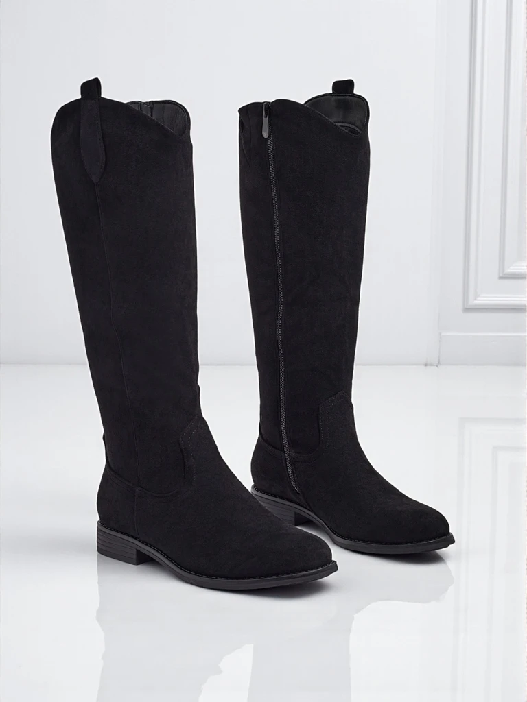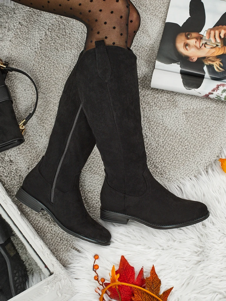 - Стильные женские сапоги до колена на плоской подошве. Голенище выполнено из эко-замши, внутри утепление в виде меха. Модель застегивается на молнию. Идеально подходят для повседневных осенних образов!