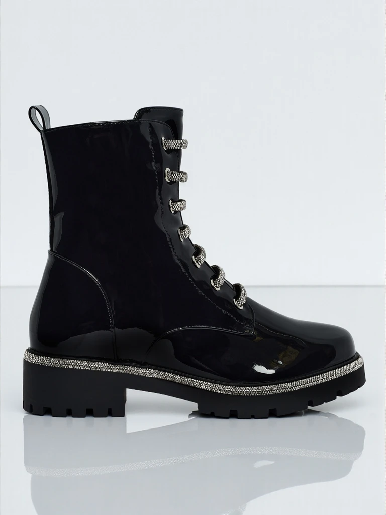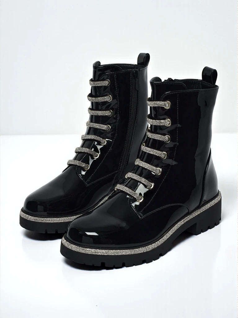 • Женские ботинки из лакированной экокожи с молнией, декоративной шнуровкой и круглым носком, дополнительно утеплены мехом – современность, удобство и стиль в одном.