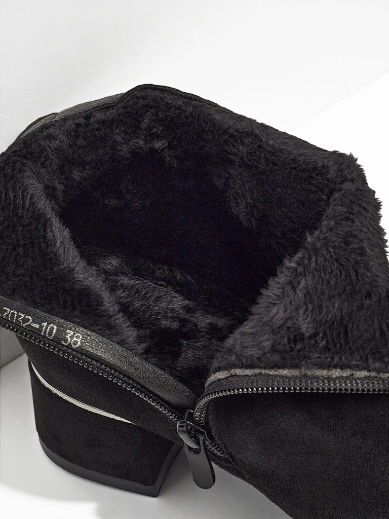 - Прекрасные ботильоны на каблуке-столбике, выполненные из эко-замши. Модель застегивается на молнию. Модель слегка утеплена мехом, имеет декоративную молнию сзади голенища.