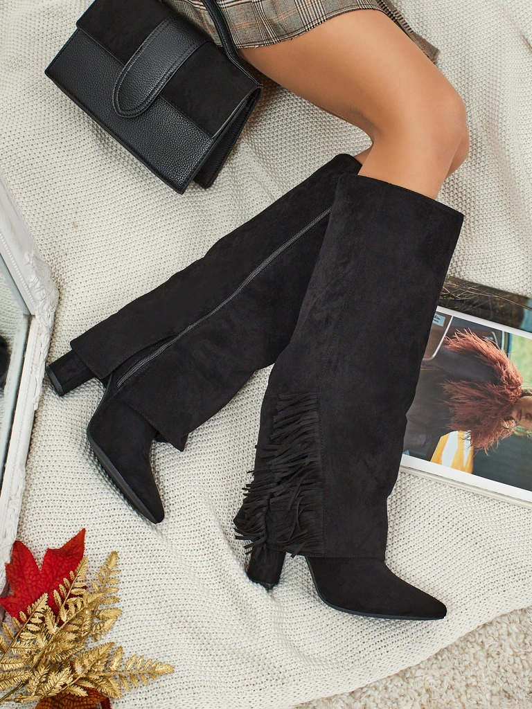 • Женские казаки на каблуке, с заостренным носком, выполнены из эко-замши и дополнены декоративным голенищем с бахромой. Обувь застегивается на молнию, утеплена внутри мехом. Подходят ко многим женским стилизациям!