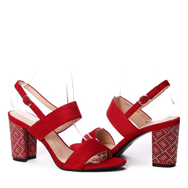 - Sandały na słupku wykonane z ekologicznego zamszu. Posiadają ozdobne cyrkonie, które znajdują się na obcasie. Zapinane na sprzączkę z boku. Sprawdzą się idealnie do każdej eleganckiej stylizacji.