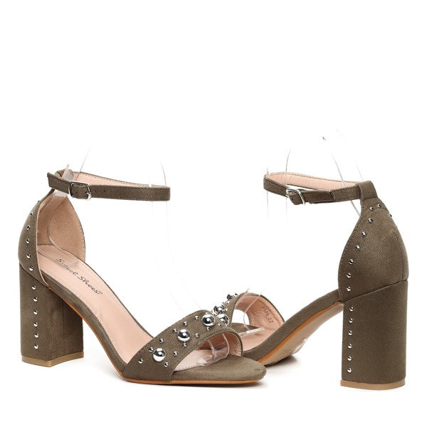 - Piękne sandały wykonane z ekologicznego zamszu na słupku. Na paseczku oraz obcasie ozdobne, srebrne dżety. Buty zapinane na sprzączkę, która znajduje się z boku. Polecane zarówno do spodni jak i eleganckich kreacji.